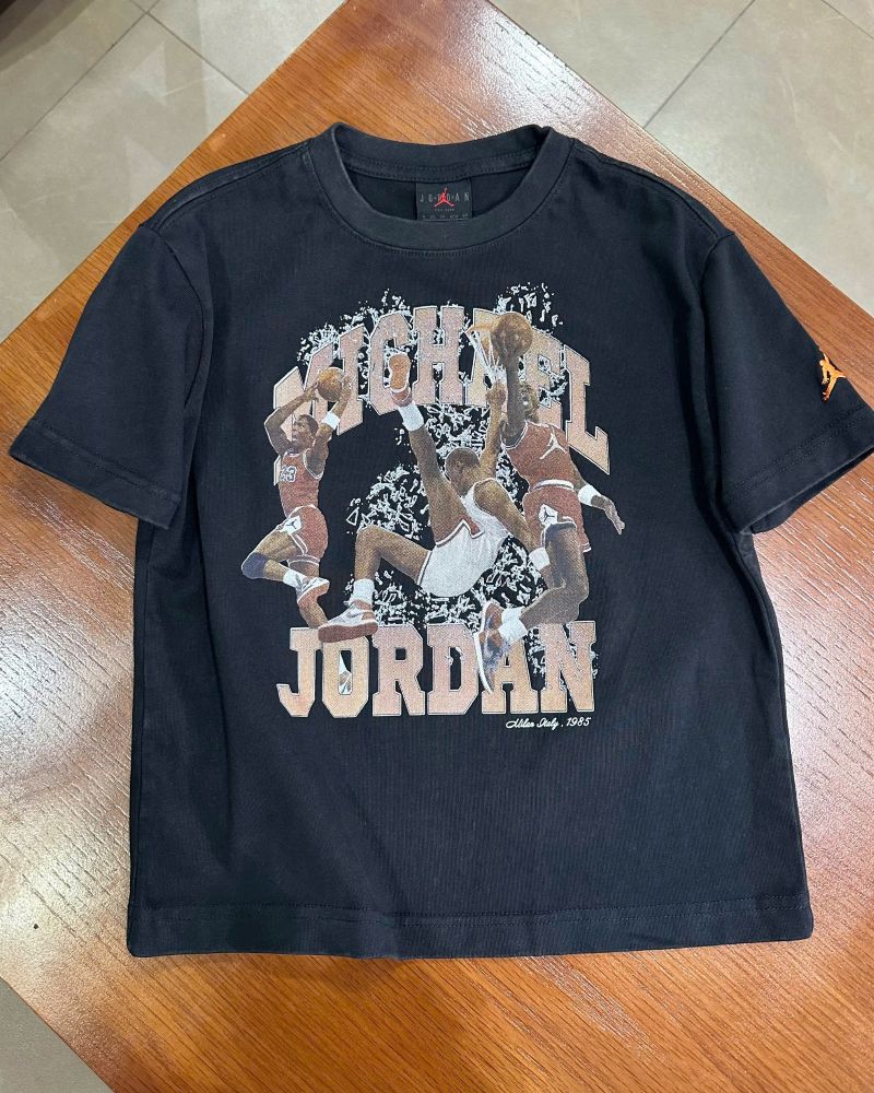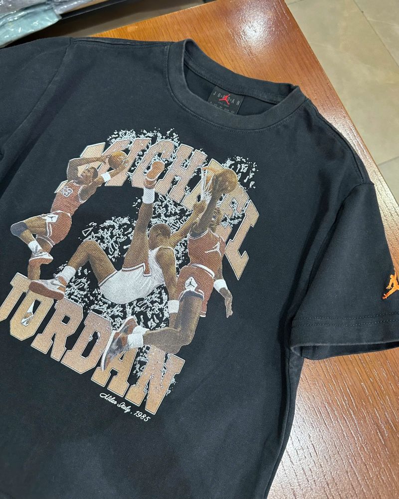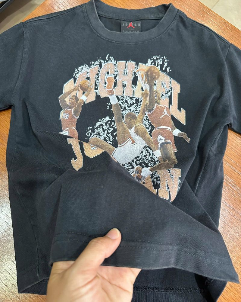 Thiết kế độc đáo: Hình ảnh Michael Jordan trong những pha bóng kinh điển được in nổi bật, tạo hiệu ứng thị giác ấn tượng. Màu đen xám (phai nhẹ) mang đến vẻ ngoài cá tính, bụi bặm và thời thượng.