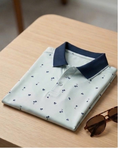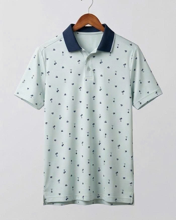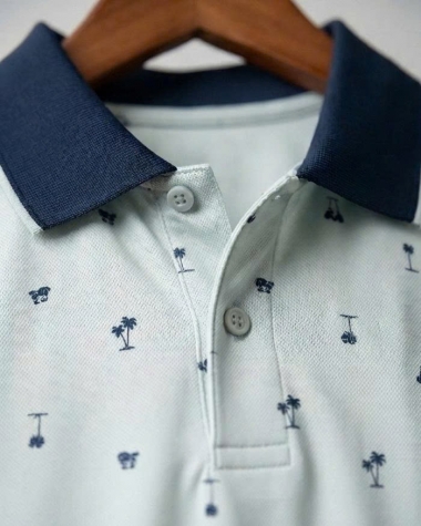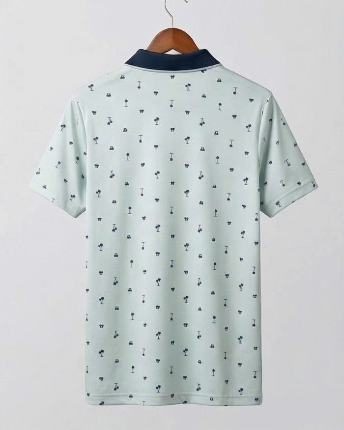 Áo sở hữu tông màu xanh nhạt mát mắt, điểm xuyết bởi các họa tiết nhỏ (cây dừa, xe golf) mang đậm phong cách phóng khoáng, năng động. Phần cổ áo màu xanh đen (navy) tạo điểm nhấn tương phản sắc nét, giúp gương mặt người mặc trông sáng và nam tính hơn.