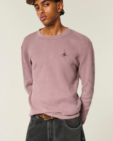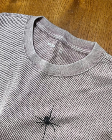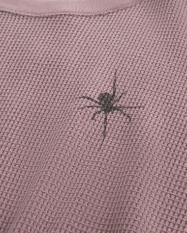 Dịch: Chiếc áo thermal tay dài lấy cảm hứng từ phong cách Y2K, được làm từ vải dệt tổ ong (waffle) siêu mềm. Thiết kế cổ tròn, với họa tiết nhện in ở ngực trái và họa tiết mạng nhện dọc hai bên tay áo.