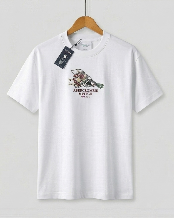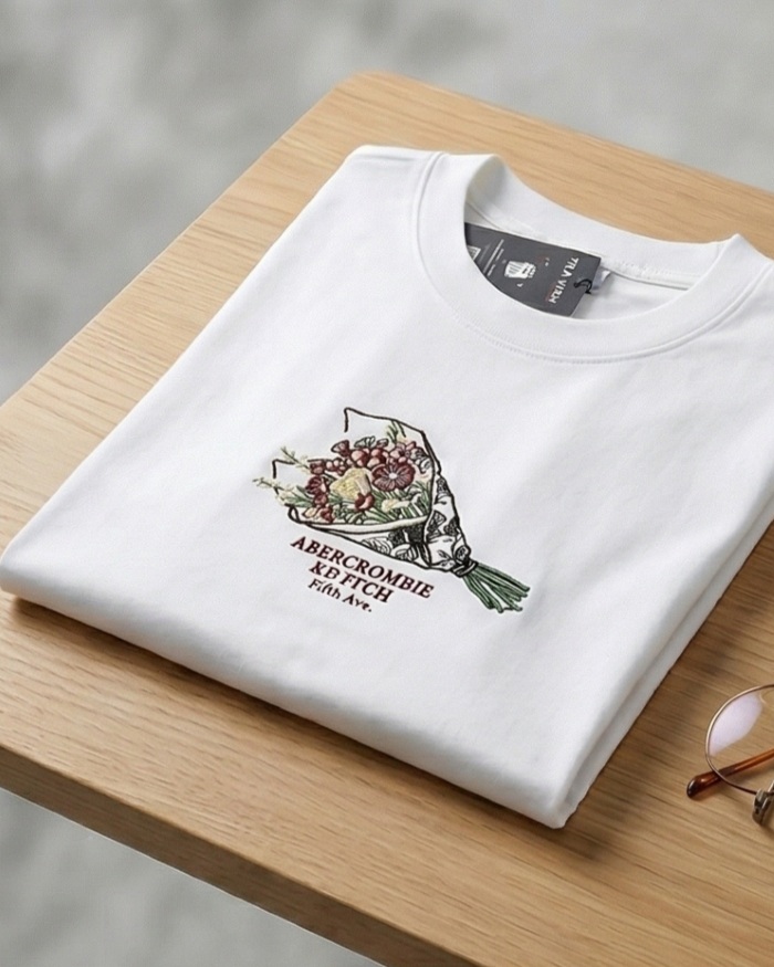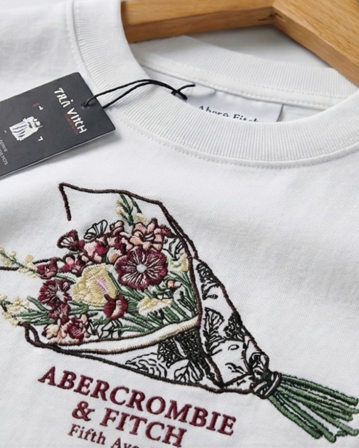 Thiết kế độc đáo: Điểm nhấn là hình ảnh bó hoa được in/thêu sắc nét giữa ngực kèm dòng chữ thương hiệu Abercrombie & Fitch - Fifth Avenue, tạo nên vẻ ngoài thanh lịch nhưng không kém phần trẻ trung.
