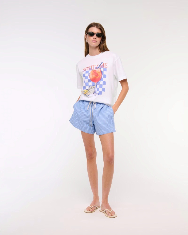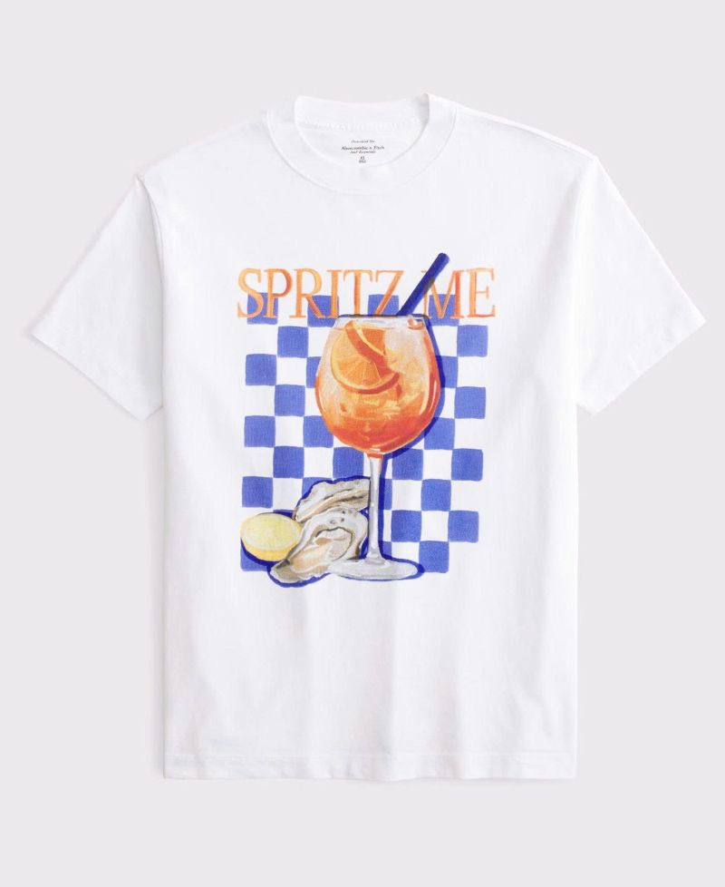 Điểm nổi bật của chiếc áo là họa tiết in graphic ấn tượng ở mặt trước, lấy cảm hứng từ đồ uống Aperol Spritz mát lạnh. Hình ảnh ly Spritz với lát cam, đi kèm dòng chữ "Spritz Me" nổi bật trên nền caro xanh trắng, tạo nên một tổng thể vừa nghệ thuật, vừa bắt mắt, mang đậm tinh thần mùa hè. Chi tiết này giúp bạn dễ dàng thể hiện cá tính riêng và thu hút mọi ánh nhìn.