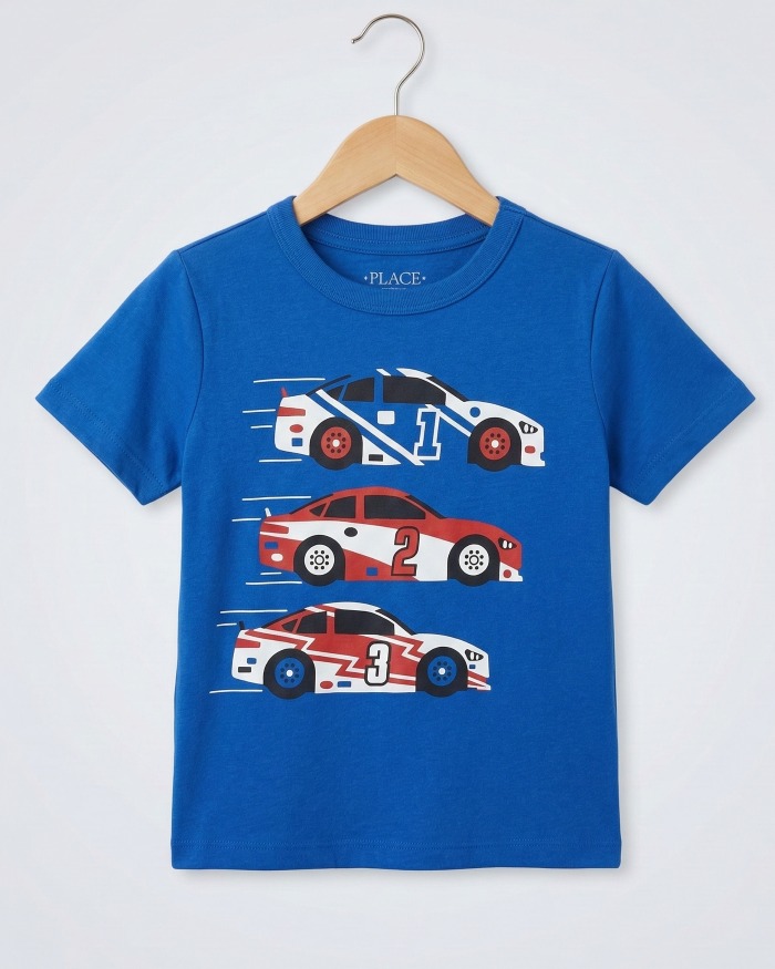 Họa tiết: Hình in 3 chiếc xe đua (số 1, 2, 3) sắc nét, màu sắc rực rỡ, không bong tróc hay nứt vỡ khi giặt máy.