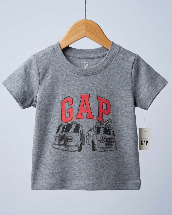Thiết kế: Form áo chuẩn, cổ tròn basic dễ phối đồ. Điểm nhấn là logo GAP đỏ nổi bật cùng hình in xe cứu hỏa sinh động, sắc nét, không bong tróc khi giặt máy.