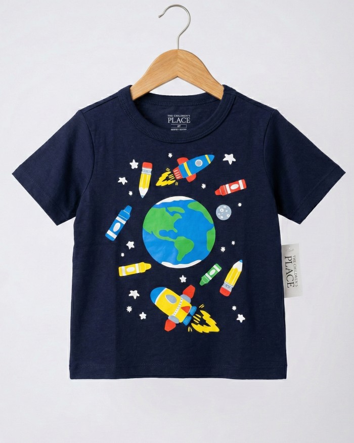 Thiết kế: Form dáng năng động, cổ tròn thoải mái. Họa tiết in sắc nét với hình ảnh Trái Đất, tên lửa, bút chì và sáp màu rực rỡ trên nền vải xanh navy sạch sẽ.