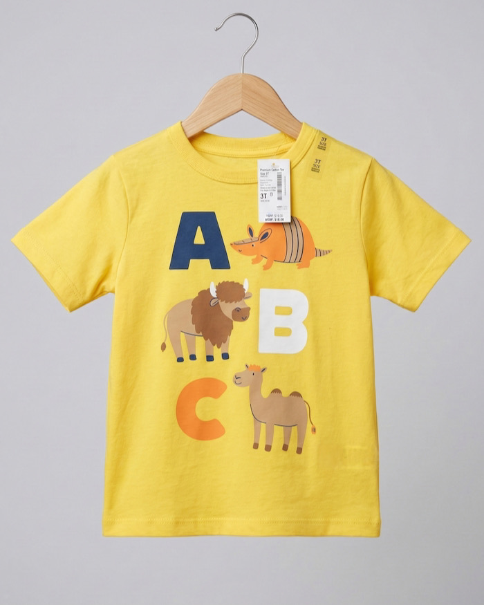 Thiết kế: Hình in chữ cái "ABC" kết hợp cùng các nhân vật động vật ngộ nghĩnh (Armadillo - Con Tatu, Buffalo - Con Trâu, Camel - Con Lạc Đà) giúp bé vừa mặc đẹp vừa học hỏi thêm về thế giới xung quanh.