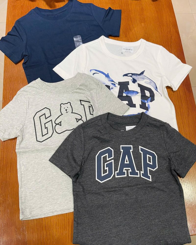 | GAP | Trắng Tinh | Hình cá mập và cá voi (Sharks and Whales) in lớn trên chữ GAP màu navy. | Chủ đề đại dương, mạnh mẽ. |