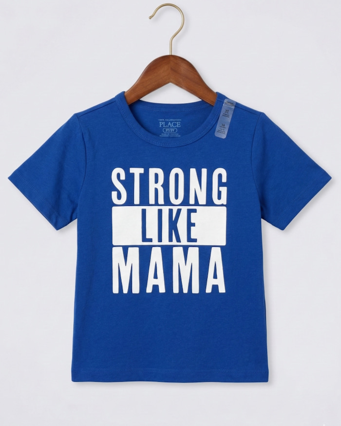 Mang đến phong cách năng động và thông điệp đầy yêu thương, mẫu áo thun từ thương hiệu nổi tiếng The Children's Place (USA) là lựa chọn hoàn hảo cho tủ đồ của bé trai. Với màu xanh cobalt nổi bật và dòng chữ "Strong Like Mama", bé không chỉ trông thật bảnh bao mà còn cực kỳ đáng yêu.