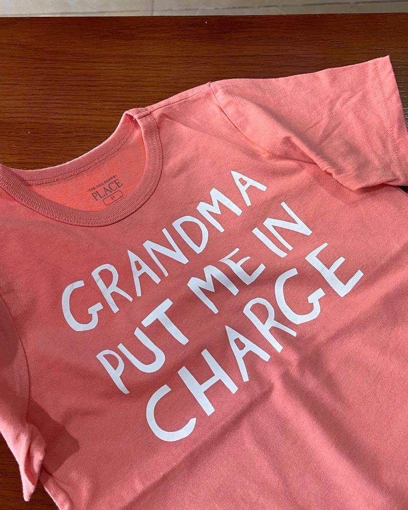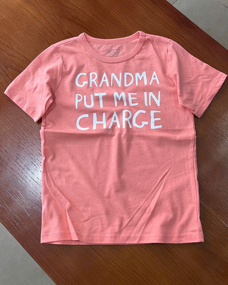 Được làm từ chất liệu cotton mềm mại, thoáng mát, chiếc áo thun này sẽ là lựa chọn tuyệt vời cho các bé trai trong những ngày hè. Với câu chữ ngộ nghĩnh, đáng yêu "Grandma Put Me In Charge" (Bà đã giao tớ phụ trách), chiếc áo không chỉ mang lại sự thoải mái mà còn thể hiện cá tính tinh nghịch của bé.