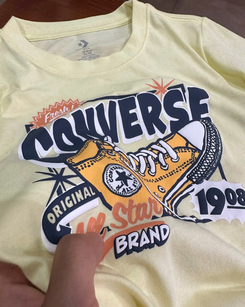 Thiết kế độc đáo: Họa tiết in hình đôi giày Chuck Taylor All Star cùng logo Converse nổi bật, mang đến vẻ ngoài cổ điển nhưng không kém phần hiện đại. Màu vàng nhạt tươi sáng, dễ phối hợp, tạo cảm giác nhẹ nhàng và thoải mái.
