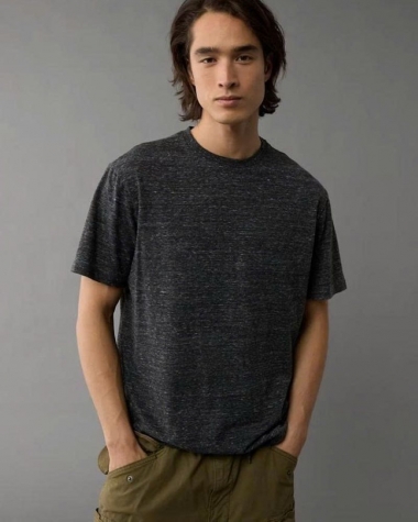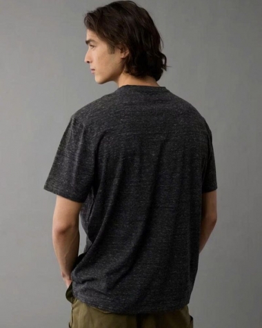 Chiếc áo được làm từ vải mélange, tạo hiệu ứng các sợi màu xám đậm và xám nhạt đan xen, mang lại vẻ ngoài trẻ trung và hiện đại. Điểm nhấn tinh tế là logo đại bàng nhỏ đặc trưng của American Eagle được in trên ngực áo.