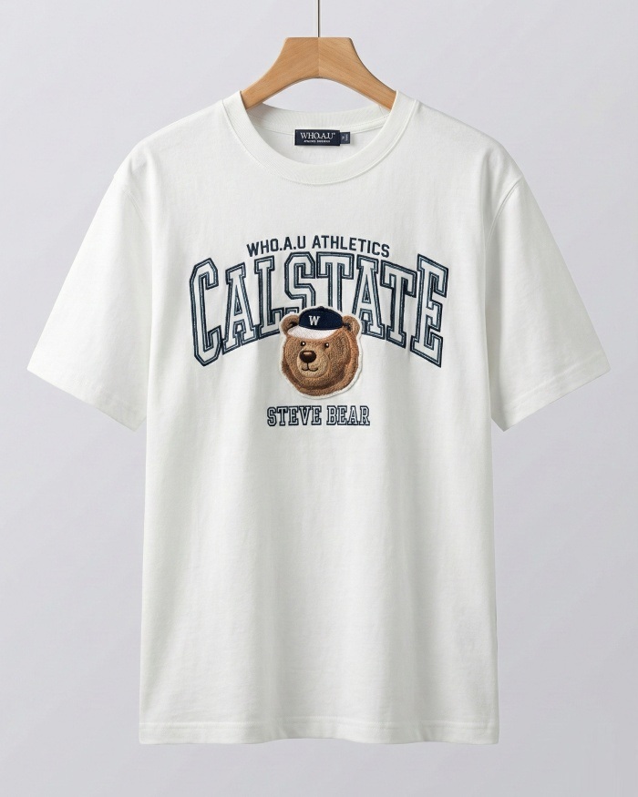 Điểm đắt giá nhất trên các dòng áo của WHO.AU chính là hình thêu gấu Steve (hoặc logo biểu tượng tùy mẫu) được thực hiện vô cùng tỉ mỉ và sắc nét ở ngực áo. Đây là dấu ấn giúp chiếc áo thun trắng trơn trở nên cá tính, đẳng cấp và có nhận diện thương hiệu cực cao.