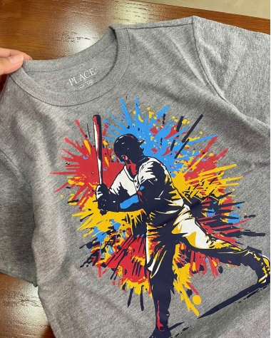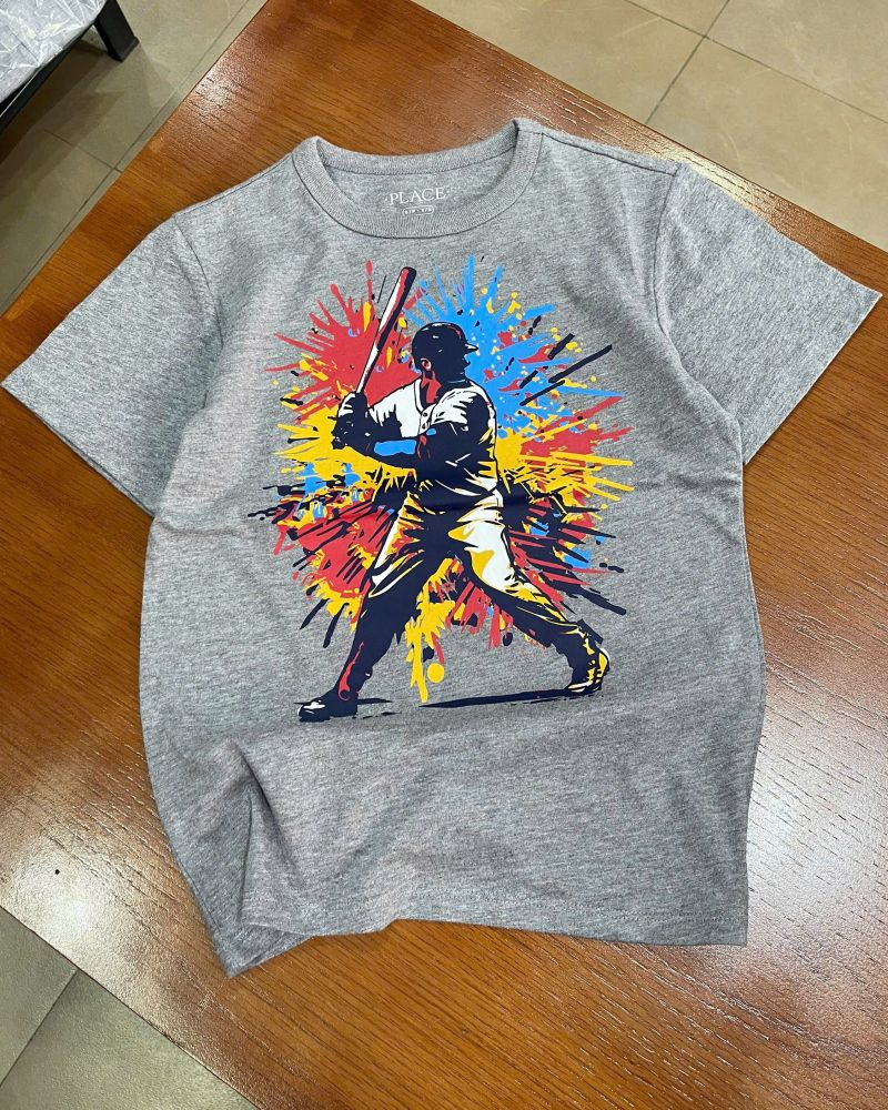 Hãy khơi dậy tinh thần thể thao trong bé với chiếc áo thun The Children's Place màu xám thời trang này. Nổi bật trên nền áo là hình in cầu thủ bóng chày đang vung gậy đầy uy lực, được tạo điểm nhấn bằng những vệt màu rực rỡ, mang đến vẻ ngoài cực kỳ năng động và cá tính.