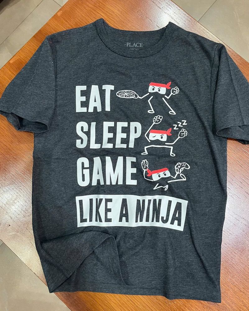 Chiếc áo thun The Children's Place màu xám chuột này là lựa chọn hoàn hảo cho những bé trai có phong cách sống năng động và yêu thích sự bí ẩn của ninja. Áo in ba dòng chữ lớn: "EAT - SLEEP - GAME" cùng với hình minh họa một ninja đang làm từng hoạt động đó. Phía dưới là dòng chữ "LIKE A NINJA".