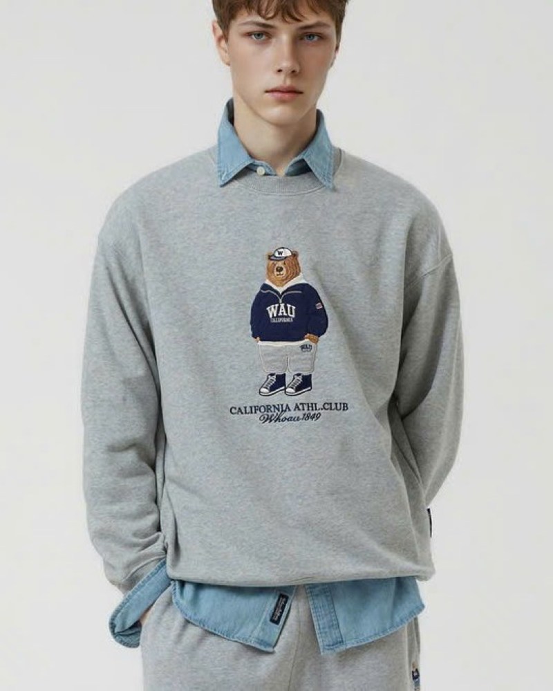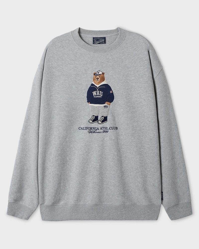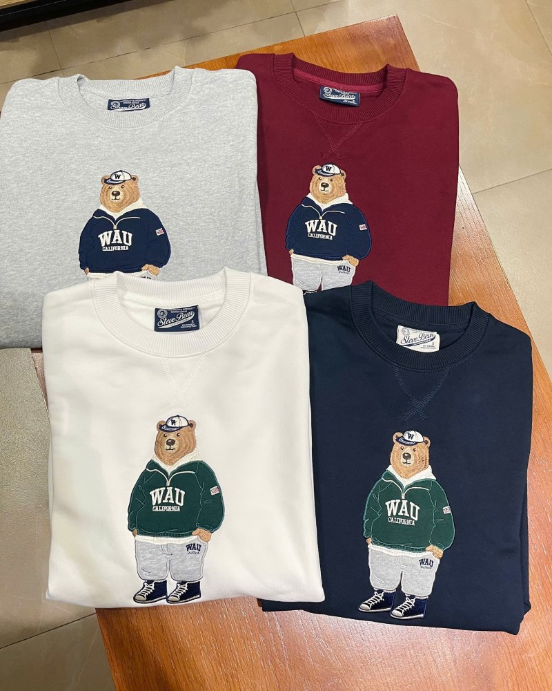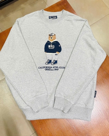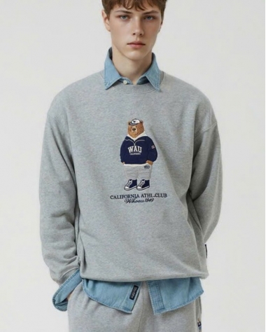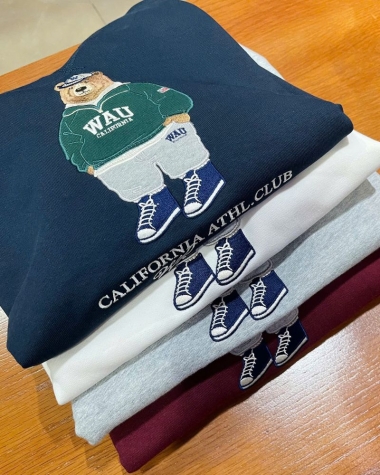 Điểm nhấn: Hình gấu Who.A.U (biểu tượng đặc trưng của hãng) được thêu nổi bật và sắc nét ở mặt trước ngực. Hình gấu mặc áo hoodie và đội mũ, kèm theo dòng chữ "CALIFORNIA ATHL. CLUB WHO.A.U 1949" mang đậm chất thể thao học đường (Athletic Club) của Mỹ, tạo nên vẻ ngoài thời trang, cá tính và "chất lừ".