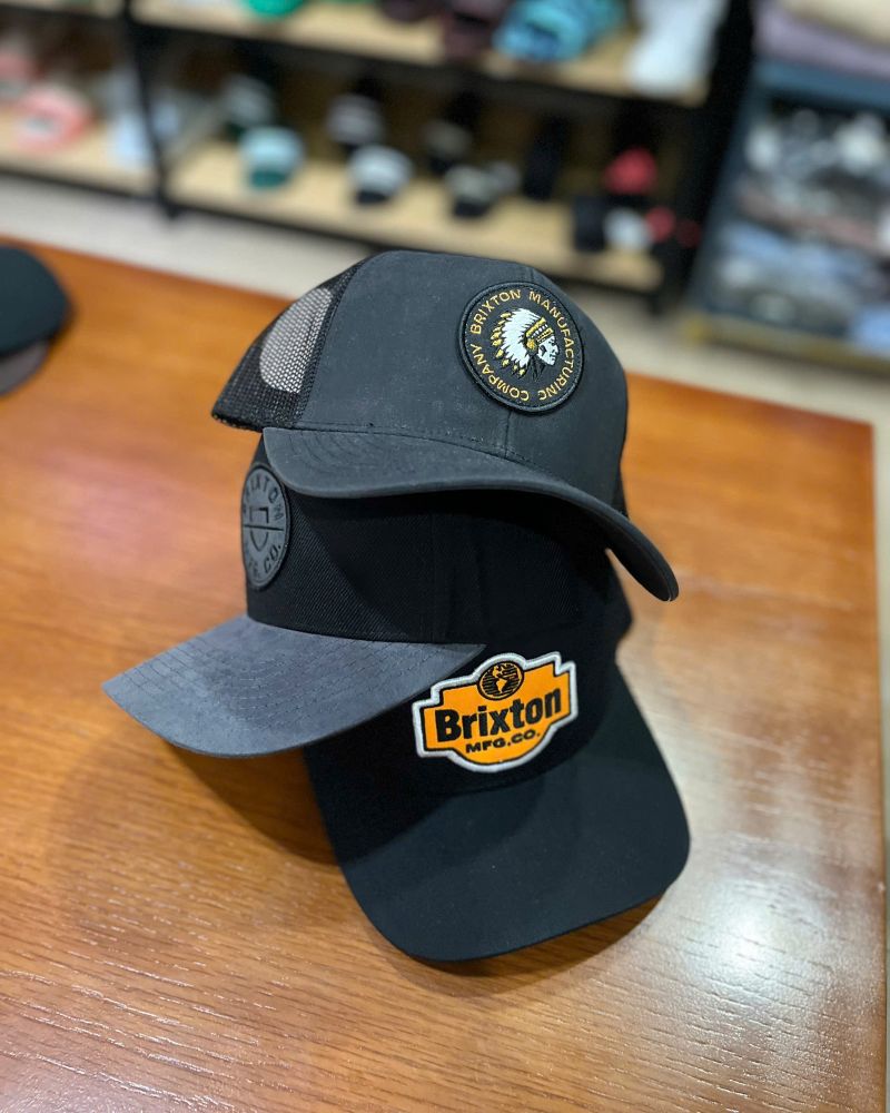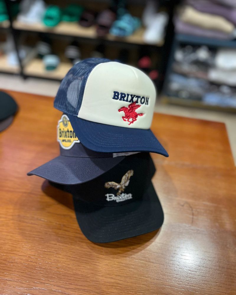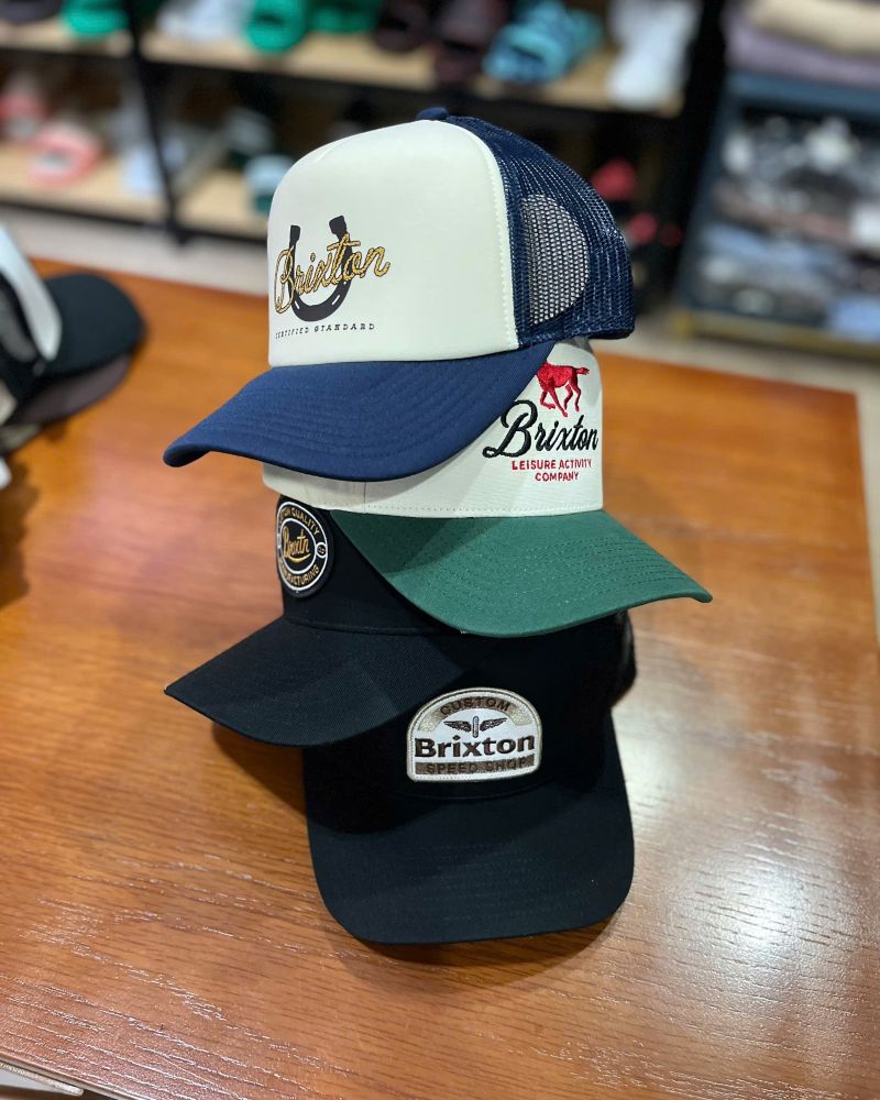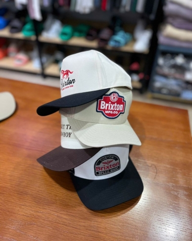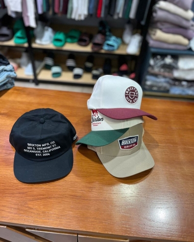 Snapback & Strapback: Kiểu dáng cổ điển, dễ dàng điều chỉnh kích cỡ. Nổi bật với các thiết kế logo đa dạng, từ hình ảnh ngựa chiến (logo thường thấy) cho đến các nhãn vá (patch) mang tính biểu tượng, như "Brixton MFG. CO." hoặc "Brixton Speed Shop" (xem hình ảnh).