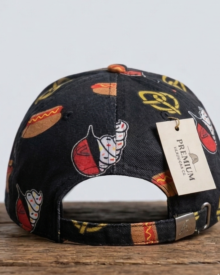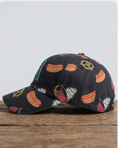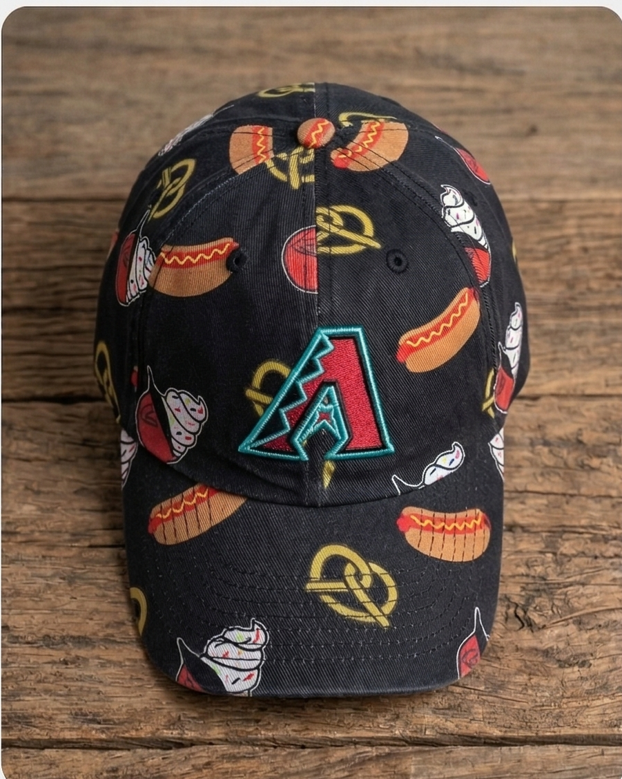 Khác với những chiếc nón trơn đơn điệu, phiên bản này sở hữu họa tiết All-over Print cực kỳ bắt mắt với hình ảnh: Hot dog, kem ốc quế và bánh Pretzel – những món ăn đặc trưng tại các sân vận động Mỹ. Kết hợp cùng logo thêu nổi 3D sắc nét của đội bóng chày Arizona Diamondbacks, chiếc nón mang đậm tinh thần thể thao và sự vui nhộn.