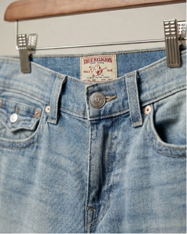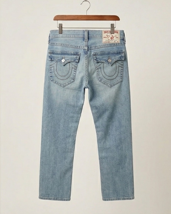 Chi tiết: Túi sau có nắp gập kèm nút cài cùng họa tiết móng ngựa (Horseshoe) thêu nổi bật – nét đặc trưng không thể nhầm lẫn của True Religion.