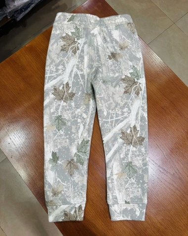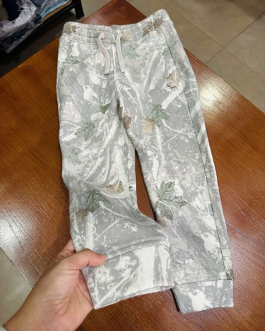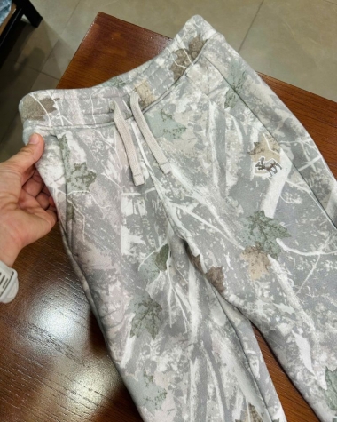 Họa Tiết Độc Đáo: Hoạ tiết rằn ri/lá cây (Mossy Oak style) phối màu trắng xám và xanh rêu tạo nên vẻ ngoài thời trang, bụi bặm và rất "chất" – một điểm nhấn khác biệt giữa các kiểu quần nỉ trơn thông thường.