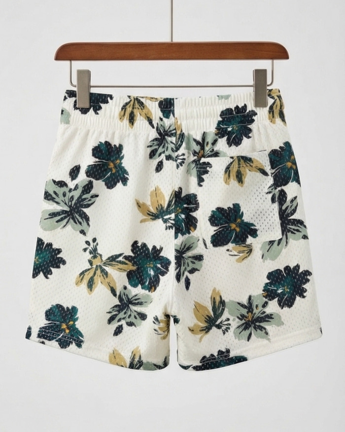 Họa tiết Tropical thời thượng: Sự kết hợp giữa tông màu trắng kem chủ đạo và các họa tiết hoa lá (xanh than, vàng mù tạt, xám nhạt) tạo nên vẻ ngoài vừa nam tính, vừa nghệ thuật.