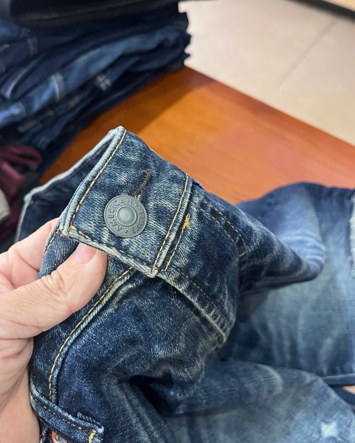 Chi tiết tinh tế: Khuy cài và khóa kéo kim loại bền bỉ, tag da biểu tượng chim đại bàng phía sau lưng quần khẳng định giá trị thương hiệu.