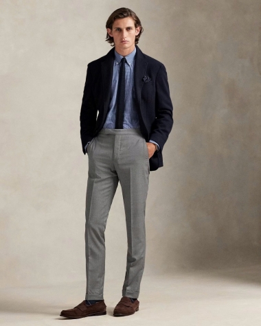 Phong cách Smart Casual: Mặc cùng quần Chinos màu be hoặc nâu. Khoác ngoài bằng áo Blazer (nhung, cotton hoặc len mỏng) màu Navy. Đi kèm giày Loafer hoặc Derby da.