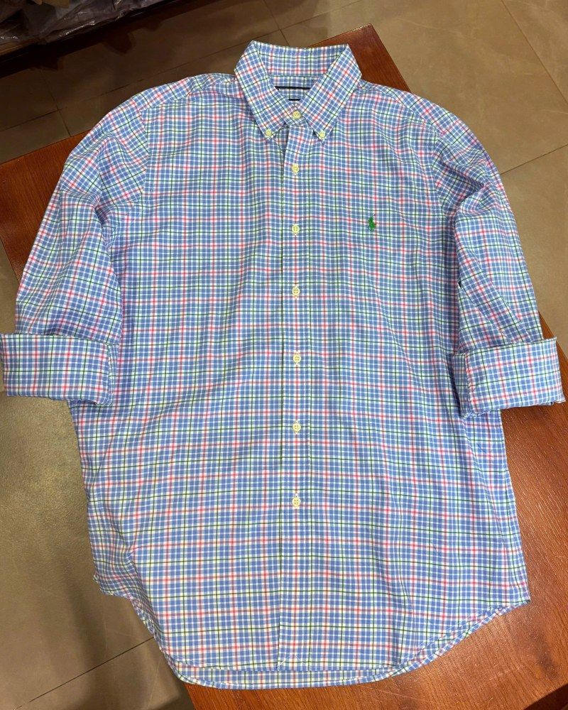 Chiếc áo sơ mi Ralph Lauren tay ngắn này mang họa tiết caro (Gingham/Check) với sự kết hợp tươi mới của màu Xanh Ngọc (Turquoise), Xanh Dương Đậm (Navy/Cobalt) và Trắng. Màu sắc rực rỡ, trẻ trung này rất phù hợp cho mùa hè và các hoạt động ngoài trời. Điểm nhấn là logo Polo Pony được thêu tinh tế bằng chỉ Màu Xanh Lá nổi bật trên túi ngực.