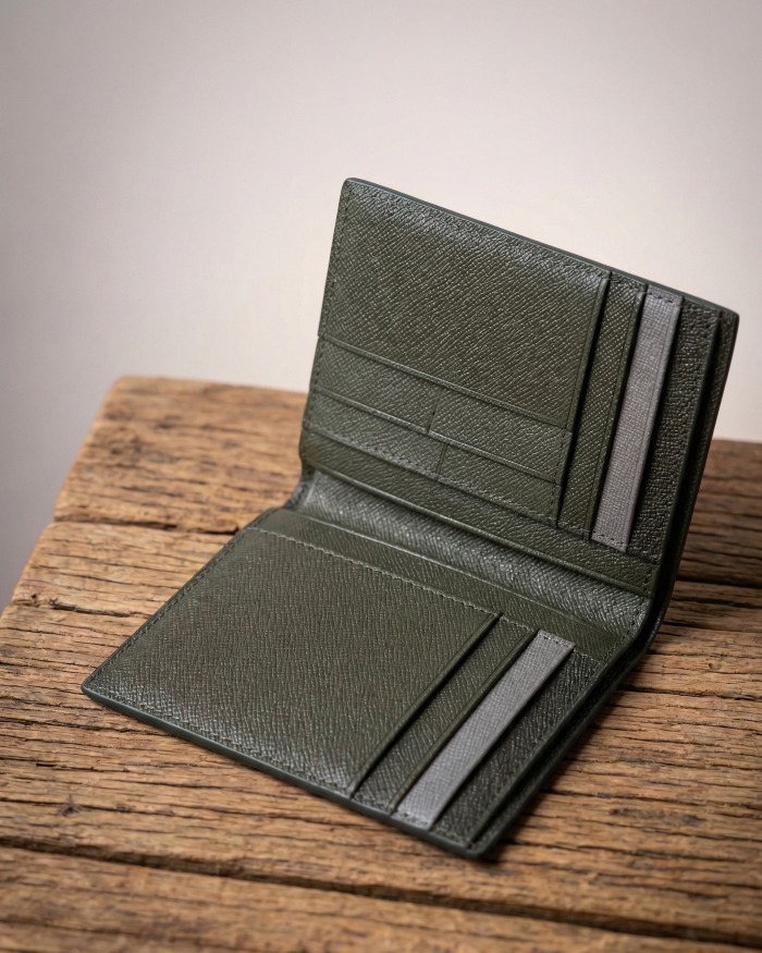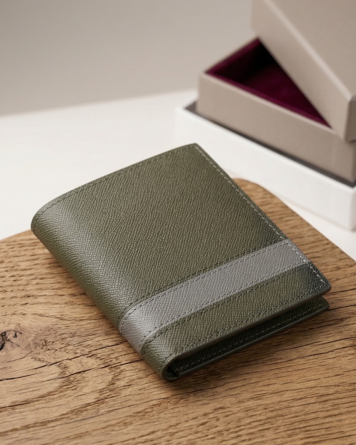 Phối màu độc đáo: Sự kết hợp giữa tông màu Xanh Ô Liu (Olive) nam tính, trầm ổn cùng điểm nhấn Xám hiện đại ở các ngăn thẻ, tạo nên sự khác biệt so với các dòng ví truyền thống.